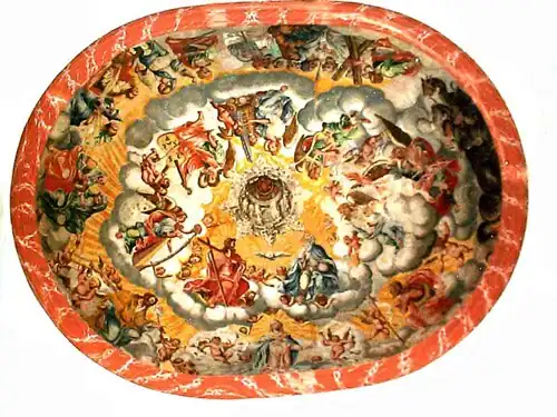 La cúpula está pintada (1772) al fresco, y representa una alegoría de la Gloria y el Dragón infernal. Las pechinas representan los atributos del santo.