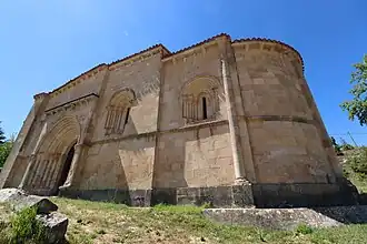 En el testero este se localiza el ábside, semicircular, más bajo, con cubierta cónica. Entre uno y otro se encuentra un volumen intermedio, tanto en anchura como altura, que supone una prolongación de la zona del presbiterio. Hay dos medias columnas adosadas al ábside que llegan hasta el alero. La cornisa es sin decoración y los canecillos muy sencillos. A media altura se encuentra una imposta ajedrezada que llega hasta la portada del muro sur