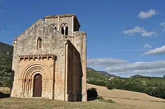 La cabecera, formada por las tradicionales secciones recta y semicircular, en sencilla.[3] Cuenta con cinco ventanas, tres de ellas ciegas y una imposta.[3] El alero se sustenta sobre canecillos decorados con motivos muy variados: animales, bustos, músicos, acróbatas...[3]