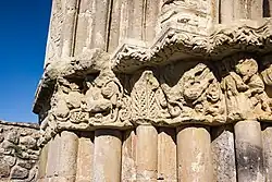Los muros del presbiterio presentan arquerías ciegas polilobuladas, con dos capiteles simples a los lados y uno doble en el centro. En el muro norte, el capitel doble muestra tres figuras, la central portando una bolsa al cuello y las laterales sujetando a la primera con cadenas; por su parte, el capitel izquierdo muestra un jinete sujetando las bridas del caballo y el capitel derecho exhibe una pareja de personajes con sus manos en las fauces de leones. En el muro sur, el capitel doble y el capitel izquierdo presentan decoración vegetal y el capitel derecho presenta dos grifos afrontados.[6]