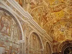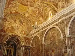 El interior presenta una decoración de artísticos frescos en la casi totalidad del recinto realizados por Pascual Mespletera (1737), los cuales han sido totalmente restaurados en 2018, se la puede denominar la capilla sixtina del maestrazgo. Este pintor, fue el mismo que decoró la Capilla de la Comunión de la Iglesia de Catí. El último tramo es el transaltar que también está decorado con las pinturas de Francesc Blasco son de 1760. Han sido retocadas posteriormente.