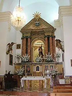 El altar mayor se encuentra cubierto por un retablo de tipo clásico, con columnas jónicas, rematado por un frontón. Colocada en alto detrás del altar mayor existe una pequeña capilla, el Camarín, para exposiciones de la imagen de Nuestro Padre Jesús del Calvario, de forma que ésta es visible a través del centro del retablo. El Camarín existe con estas características en iglesias españolas, el primer ejemplo que encontramos es el de la iglesia de Los Desamparados de Valencia. Frente al altar mayor y encima de la entrada está situado el coro, sostenido por un gran arco carpanel y en sus laterales por ménsulas de formas mixtilíneas de conchas.
