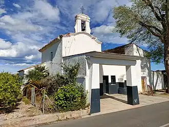 La fachada presenta remate en frontón mixtilíneo del que parte un hastial con un hueco central en el que cabe una campana, y hace las veces de espadaña, que se remata con una cruz de forja.[1][5]