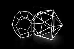 La instalación Geometrías de luz está compuesta por cinco esculturas lumínicas interactivas, creadas a partir de las cinco formas geométricas que Platón asoció con los elementos: el tetraedro (fuego), el hexaedro (tierra), el octaedro (aire), el icosaedro (agua) y el dodecaedro (universo o cosmos). En esta obra se reconfiguran estas formas, también conocidas como sólidos platónicos o geometría sagrada, seccionándolas por la mitad y reflejándolas sobre la superficie de un espejo cúbico (hexaedro). Este gesto de corte y simetría genera una ilusión óptica que transforma la percepción de la forma original. La fragmentación de estos cuerpos geométricos, convertidos en esculturas lumínicas e interactivas, invita a reflexionar sobre los límites entre lo real y lo ilusorio, lo tangible y lo intangible, proponiendo una experiencia inmersiva y multisensorial que cuestiona la percepción del espectador. [11][12][13]