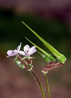 Erodium: nombre genérico que deriva del griego erodios = "una garza" debido al largo pico en el fruto.[2]