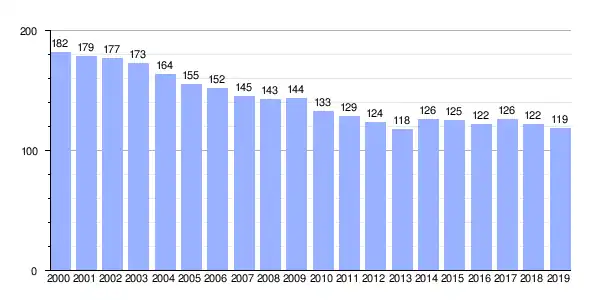 | Gráfica de evolución demográfica de Erviñou (parroquia) entre 2000 y 2019 |