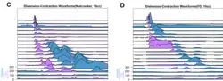La distensión se muestra con forma de onda y la contracción (presión) como topografía en mapa de calor.