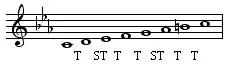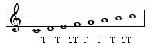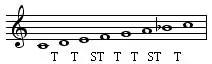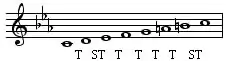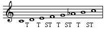 Las escalas mayores de primer tipo resultantes constan, por orden, de los siguientes tonos (T) y semitonos (st): T–T–st–T–T–T–st (dos tonos, semitono, tres tonos, semitono). Aplicando la fórmula anterior para la Escala de Do Mayor, daría como resultado la secuencia: