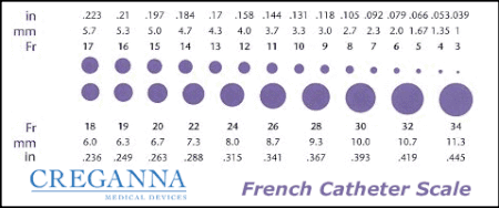 Por ejemplo, si el tamaño es 9 French, el diámetro en milímetros es de 3 mm. El French es equivalente al diámetro en mm multiplicado por tres, y no la circunferencia (diámetro por π) que es como a veces se piensa.
