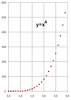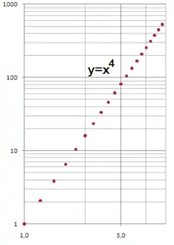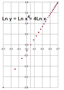 | y = x4 (lin-lin) | y = x4 (log-log) | Ln y = 4·Ln x (log-log) |