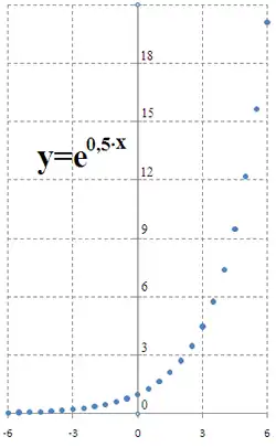 | y = e0,5·x (lin-lin) | y = e0,5·x (lin-log) | Ln y = Ln e0,5·x = 0,5·x (log-log) |