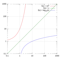 y = x, y = 10x, y = log (x).