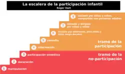 Roger Hart publicó en 1992 una versión adaptada para UNICEF de la escalera de Arnstein, adaptada a la participación infantil y juvenil. Cuenta también con ocho peldaños, divididos en dos tramos, y en esta versión la población adulta es la que ostenta el poder: