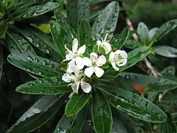 Puede crecer hasta 4 m (13,1 pies) de alto y 2,5 m (8,2 pies) de ancho, y tiene hojas brillantes de color verde oscuro que son de 2 a 7 cm de largo y de 0,8 a 2 cm de ancho. Las flores son de color blanco puro, inicialmente tubulares pero luego extendidas, aparecen en verano.