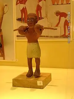 - Bȝk : El término bȝk es la forma más controvertida en cuanto a su traducción. Parece ser más que un sirviente normal.[11] Sin embargo, una estrella del Imperio Antiguo de Egipto describe la adquisición de Bȝk.w, que demuestra la posibilidad de una transferencia de propiedad.[12]