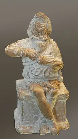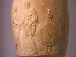 Por último, también se utilizaban en las casas. El criado tenía como labor sustituir al dueño de la casa en su trabajo y acompañarlo en los trayectos y viajes. En tiempos de guerra, servía de escudero para el hoplita.[46] La mujer esclava, por su parte, se ocupaba de las tareas domésticas, en especial de la elaboración del pan y de la fabricación de tejidos. Solo las familias más pobres carecían de esclavo doméstico.[47]