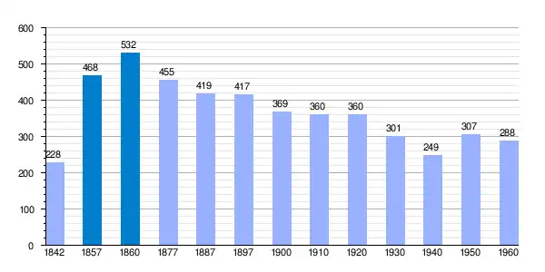 Población de derecho según los censos de población del INE Población de hecho según los censos de población del INEEntre el censo de 1857 y el anterior, crece el término del municipio porque incorpora a 255060 (Betrén) |