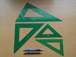 Los juegos de escuadras se utilizan en dibujo técnico, permitiendo trazar un ángulo recto u otro ángulo plano particular, apoyando una de ellas sobre la otra, colocada a su vez sobre la alineación de referencia. Por lo general, están hechos de plástico transparente. Los juegos más comunes son las escuadras de 45° (una esquina de 90° y dos esquinas de 45°) y los triángulos de 60/30 (con esquinas de 90°, 60° y 30°). Otro tipo es la escuadra ajustable, que presenta un borde que se puede acomodar a cualquier ángulo de 0° a 90°.[15][16] |