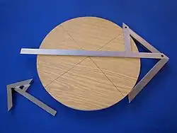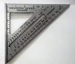 | Escuadra rápida, escuadra de viga, escuadra de ángulo de viga, escuadra de triángulo, o escuadra de diseño | Una escuadra rápida es una escuadra de carpintero triangular que combina las funciones de escuadra combinada, escuadra de comprobación y escuadra de enmarcado en una sola herramienta. Se puede utilizar para calcular y marcar ángulos, para suspender una plomada y como guía para una sierra circular.[17][18][19] | |
