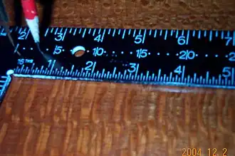 - Los ángulos de corte se pueden determinar alineando el número marcado en la hoja larga de la escuadra y la marca de doce pulgadas en el brazo corto, y trazando una línea apoyada en el brazo corto.