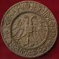 ...tres cuarteles con un castillo en campo dorado y una llave dorada pendiente de él.[8]
