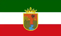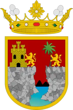 En gules, una cima al natural moviente del flanco diestro, sumada de un castillo de oro abierto y siniestrado por un león de oro empinante; en la siniestra, en una cima leonada, una palma de sinople frutada en oro, sostenida por un león rapante de oro; en centro, entre las cimas un río de azur, tras de este, en abismo, dos cimas de sinople; el todo bordeado en oro; por timbre una corona real abierta.