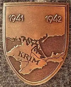El Grupo de Ejércitos Sur de la Wehrmacht avanzó a través de la península de Crimea entre el otoño de 1941 y el verano de 1942. Para conmemorar las hostilidades que terminaron con la captura alemana de Sebastopol el 4 de julio de 1942, se creó el Escudo de Crimea para todos los miembros de las fuerzas armadas bajo el comandante de área, el mariscal de campo Erich von Manstein.[2]