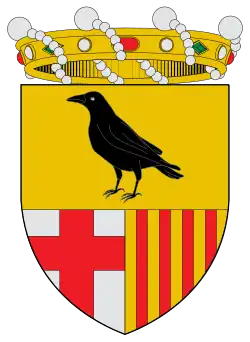 El escudo oficializado viene a sustituir el hasta entonces utilizado por el ayuntamiento, descrito por primera vez en el libro Els escuts heràldics dels pobles de Catalunya (1968), con el siguiente blasonado: Cortado y semipartido: 1º de oro, un cuervo de sable; 2º de plata, una cruz plena de gules; 3º de oro, cuatro palos de gules. Por timbre, corona de barón.[5] Este escudo, según Armand de Fluvià carece de sentido y es incorrecto desde el punto de vista histórico, ya que la villa no recibió nunca el privilegio de ser "calle de Barcelona", por tanto, no puede llevar las armas de la ciudad de Barcelona ni el señal real.