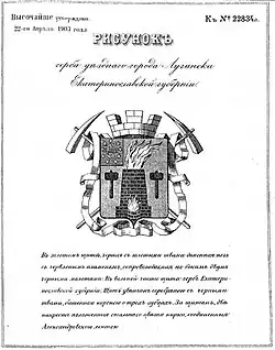 El escudo de armas de la ciudad del condado, el centro del distrito de Slavyanoserbski de la provincia de Ekaterinoslav "Vysochaishe" fue finalmente aprobado el 22 de abril de 1903.[2]