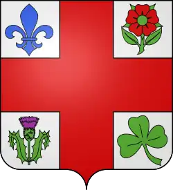 - ↑ D'argent à une croix de gueules; cantonnée au premier d'une fleur de lys d'azur; au deuxième d'une rose de gueules tigée, feuillée et pointée de sinople; au troisième d'un chardon du même, fleuri de pourpre; au quatrième d'un trèfle de sinople.