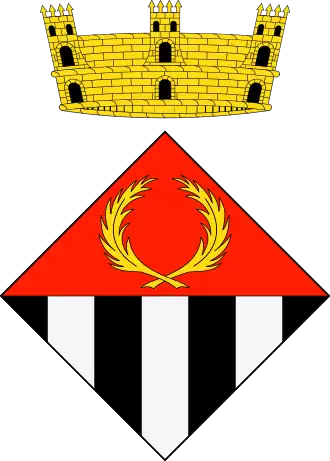 El escudo está acompañado en la parte superior de un timbre en forma de corona mural, que es la adoptada por la Generalidad de Cataluña para timbrar genéricamente a los escudos de los municipios.[2] En este caso, se trata de una corona mural de pueblo, que básicamente es un lienzo de muralla amarillo (oro) con puertas y ventanas en negro (cerrado de sable), con cuatro torres almenadas, tres de ellas vistas.