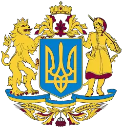 El gran escudo de armas no se ha llegado a adoptar nunca de manera oficial,[6] si bien se ha publicado en diversas fuentes heráldicas. En esta variante, el escudo de azur con el tridente de oro va flanqueado por el león de Galitzia a la diestra y un cosaco con el vestido tradicional, armado con un mosquete, símbolo del Hetmanato cosaco, a la siniestra. Está timbrado con la corona de Vladimiro I de Kiev, símbolo de la soberanía ucraniana, y decorado al final con una cinta con los colores de la bandera, espigas de trigo y frutos de la variante local del durillo. No se ha aprobado porque necesita una mayoría de dos tercios en el Parlamento de Ucrania, a la que no llega por la reticencia que muestran los comunistas y los partidos prorrusos.