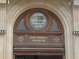 La primera ENS, la Escuela Normal Superior del año III, fue creada — bajo el impulso de Joseph Lakanal y del Comité de Instrucción Pública — el 30 de octubre de 1794 en París por la Convención revolucionaria.