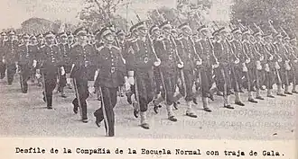 En 1939 el ejecutivo dictó un decreto por el cual se disponía la militarización de toda la segunda enseñanza, incluyendo las escuelas normales. Para el efecto fueron nombrados militares de alta graduación como directores de todos los establecimientos y el número de alumnos se redujo a lo que es en lenguaje militar una compañía. Un cuerpo de oficiales tenía a su cargo el mantenimiento de la disciplina, en tanto que los alumnos estaban divididos en soldados, cabos y sargentos.[11]