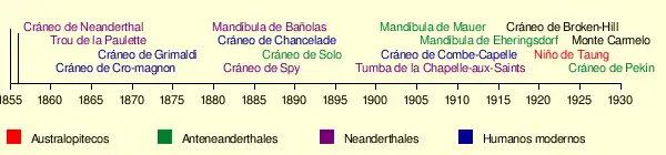 El descubrimiento del «Hombre Solo» por Eugène Dubois no fue un hecho aislado en la historia de la paleoantropología, sino que está contextualizado en una serie de hallazgos que, quizá en su momento no tuvieron suficiente significación, pero que, con el tiempo, han ido encumbrándose por su trascendencia. La siguiente línea del tiempo, que va desde la recuperación de los huesos del valle Neander, en 1856, hasta 1930 puede dar idea de lo que estamos diciendo, a destacar, el hallazgo, en 1924 del primer australopiteco por Raymond Dart, el Niño de Taung (en Sudáfrica), un homínido prehumano de extraordinaria antigüedad, que, como el caso del Hombre del Neandertal, no fue asimilado por la comunidad científica hasta algún tiempo después.[3]