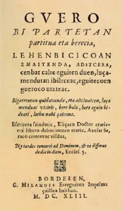 En esta época, gran parte de la población de era monolingüe en vasco. La Iglesia católica, a través del clero, difundía la espiritualidad católica en la lengua nativa de la población. En esta época también se encuentran autores como Oihenart y Juan de Tartas.