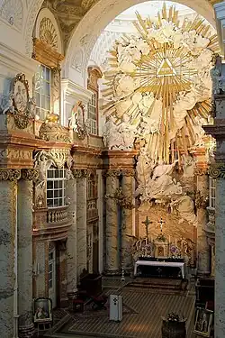 Autorretrato de Cosme Damián Asam en la decoración escultórica al estuco de la abadía de Weltenburg (1716-1739)[6] -