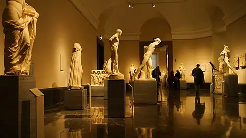La escultura griega se representa por autores como Fidias, Mirón, Policleto, Lisipo y Escopas, en versiones romanas de los originales perdidos, aunque también hay un pequeño número de esculturas griegas originales, entre las que destacan una Cabeza de caballo en mármol de c. 515 a. C. y una cabeza monumental de bronce de Demetrio I Poliorcetes de c. 307 a. C. Entre las copias romanas sobresale la del Diadúmeno de Policleto, una de las mejores y más completas de las que se conservan.[9]