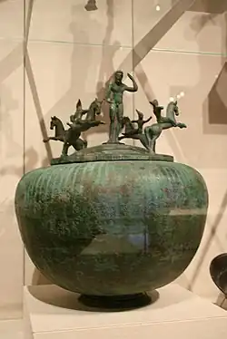 El periodo de cultura de Villanova, a veces llamado geométrico, fue el preludio de la formación de la civilización etrusca. Su nombre es el mismo que el de un importante yacimiento arqueológico, el de Villanova, descubierto en el año 1853 por Giovanni Gozzadini, cerca de Bolonia, caracterizado por el rito funerario de la inhumación y por el vaso cinerario bicónico.[19] El periodo se caracterizó por la expansión y refinamiento de la metalurgia y por un arte que empleaba a menudo motivos geométricos simples dispuestos en patrones complejos, heredados de culturas anteriores —locales y griegas—, y que permanecerían en el arte etrusco hasta tiempos históricos. La tradición local anterior —llamada cultura «protovilanoviana»— parece haber influido en la costumbre de añadir pequeños elementos escultóricos en los vasos y urnas funerarias, mientras que el elemento griego se manifiesta en la creación de diminutas figuras de animales en bronce, que básicamente imitan los diseños encontrados en los vasos.[20] Vulci fue probablemente el primer centro en tener una tradición artística típicamente etrusca, que se manifiesta en formas de vasijas y calderos con pequeños grupos de figurillas de hombres y animales en sus tapaderas. Fueron estas las primeras representaciones humanas en el arte italiano sólo atribuidas con cierta seguridad a personajes mitológicos a partir del final del periodo.[2][4]