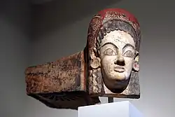 La piedra nunca fue muy utilizada en la escultura etrusca. Existen pocos ejemplos de esculturas de piedra caliza suave, alabastro o toba; el mármol es aún más raro. Sus dimensiones son modestas y su técnica bastante primitiva. Los detalles eran a menudo toscamente trabajados, pero las imperfecciones se ocultaban con la práctica de la pintura sobre la superficie. En un taller de Chiusi se esculpieron plañideras y esfinges en piedra local, mientras que en Vulci se realizaban esculturas de seres fantásticos derivados de la mitología griega.[39] Sólo en el periodo helenístico se encuentran más ejemplos de escultura en piedra, especialmente para los sarcófagos, pero la técnica no parece haber evolucionado de manera significativa.[40]