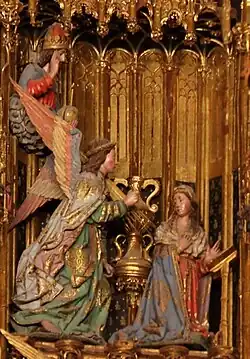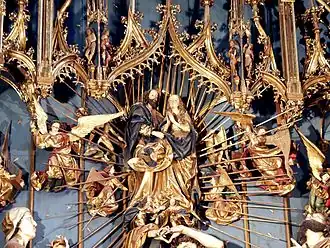 Otra tendencia evidente del período fue desarrollar un gusto por la máxima sofisticación, donde se nota de manera notable es los grandes retablos con varias escenas yuxtapuestas, que sustituyeron a las portadas de la fachada, como forma de ilustración didáctica de la doctrina en un gran panel narrativo, la propia estructura de los retablos, enmarcaban las escenas en estructuras arquitectónicas, a menudo recordando una fachada de iglesia. Así como los portales, estas grandes estructuras presentaban un programa iconográfico claramente organizado, con la ilustración de la jerarquía divina que tenían un reflejo en la tierra, bajo la forma de la iglesia instituida con el vicario de Cristo como su líder, además de sus ministros y los creyentes. Estos retablos eran ofrecidos en general por la comunidad y por tanto, tenían un significado además de religioso, social, porque servían como símbolos de la identidad de esta comunidad, cuanto más ricos y grandes, más prestigio daban a la ciudad o a la congregación. La mayor parte de los retablos poseían paneles plegables laterales, que se abrían en las grandes solemnidades religiosas, junto a la representación de Cristo, los ángeles y los santos, presentaban también las figuras del pueblo y de la jerarquía civil, algunos estaban ejecutados combinando las imágenes con unas complicadas filigranas de tracería de talla de madera. Escultores de centro Europa fueron los que más aplicaron este estilo, aunque las composiciones monumentales para retablos también llegaron a los reinos de España, por ejemplo el retablo mayor de la catedral de Toledo o el de la Cartuja de Miraflores realizado por Gil de Siloé.[44][45]