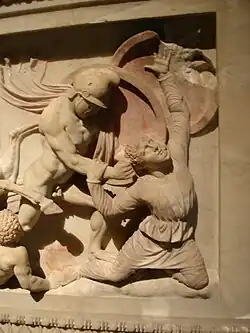 Pérgamo, entre el siglo III a. C. y el siglo II a. C., emerge como uno de los centros más activos de producción de la escultura, de acuerdo con el generoso mecenazgo de sus reyes. Bajo el mandato de Atalo I —tras sus victorias sobre los galos—, mandó construir unos grupos conmemorativos en bronce, uno fue donde se desarrolló una tipología de guerreros heridos, entre los que destacan por su patetismo las esculturas del Gálata moribundo del Museo Capitolino y el Gálata Ludovisi o Gálata suicidándose con su esposa del Museo Nacional Romano, ambos entre el 240-200 a. C., mientras que el otro grupo se realizó con las famosas amazonas luchando contra guerreros griegos, entre otras representaciones.[58] A esta escuela de Pérgamo se atribuye también el grupo del sátiro Marsias a punto de ser desollado colgado de un árbol. Siguiendo con su estilo clásico también son de destacar las esculturas del Fauno del cabrito del Museo del Prado y la Atenea de Pérgamo del Museo de Berlín, copia de la Atenea Pártenos de Fidias y el Fauno Barberini que representa un fauno, en un profundo sueño producto de su embriaguez. Fue restaurada por Bernini en el siglo XVII, actualmente en la Gliptoteca de Múnich.[56]