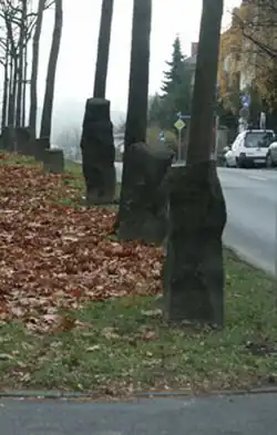 - ↑ Spiegel: Some of the art at this year's Documenta has escaped the confines of the exhibition halls and intervened in Kassel's public spaces -- like Kirill Preobrazhenskiy's "Tram 4 Inner Voice Radio," a sound installation played on a busy public transportation route. This strategy has been tried before, though. From 1982 through 1987, Joseph Beuys came to Kassel and planted 7,000 trees alongside slabs of stone as part of an installation called "7,000 Oaks," for Documenta 7. Visitors still snap photos of the trees, which have become an internationally renowned work of art. Kassel residents rarely take a second glance.