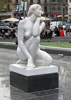 | La diosa | Josep Clarà | Mármol | 1,45 x 0,65 x 0,82 | También conocida como El enigma, esta obra se encuentra en un estanque encarado hacia las Ramblas, y fue un encargo directo al autor ajeno al concurso de 1927. De hecho, la obra se ejecutó sobre un modelo original de 1911. Colocada en la plaza en septiembre de 1928, al tratarse de un desnudo recibió fuertes críticas por parte de sectores moralistas, por lo que a los tres días fue retirada; sin embargo, fue reinstalada el 19 de mayo de 1929, un día antes de la inauguración de la Exposición Internacional, y ya se quedó definitivamente. La figura representa una mujer desnuda sentada, con una pierna con la rodilla doblada apoyada en el suelo y la otra también doblada y alzada hacia el pecho, mientras que en la rodilla de esta pierna apoya el brazo izquierdo, cuya mano se coloca en el hombro y sobre ella apoya la cabeza. La expresión facial es introspectiva, de meditación o duda, de ahí el apodo del «enigma». La anatomía de la figura es rotunda, sensual, en plena consonancia con el mediterraneísmo novecentista de moda en la época. Es la obra maestra de Clarà, y con el tiempo se ha convertido en uno de los símbolos representativos de Barcelona. En 1982 esta obra fue trasladada al vestíbulo de la Casa de la Ciudad de Barcelona, y sustituida por una copia elaborada por Ricard Sala. En 1991 se colocó junto a esta estatua el Monumento a Francesc Macià de Josep Maria Subirachs.[39] |