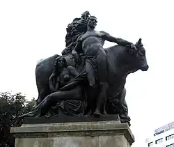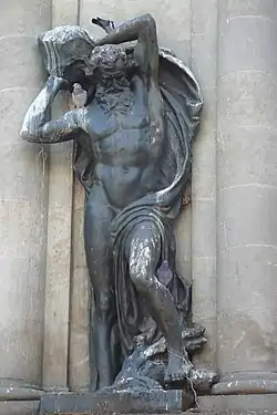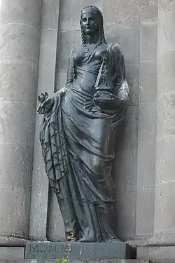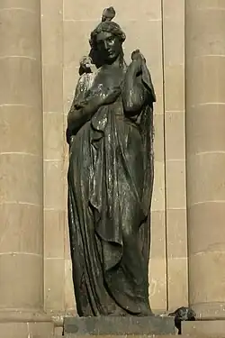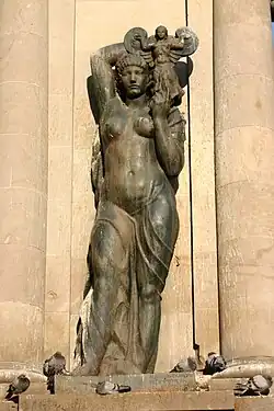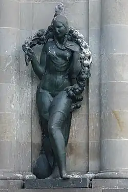 | Figura femenina | Josep Llimona | Bronce | 2,60 x 0,93 x 0,45 | Se encuentra en el mismo pilar que la anterior. Se trata de una figura de mujer sin especiales atributos, apoyada sobre el pie derecho y con la pierna izquierda doblada, en posición de contrapposto. Está vestida con túnica y manto, que sostiene con sus brazos, uno sobre el hombro y otro sobre un pecho, mientras que el otro pecho se le sale de la ropa. En la base se halla el escudo de Barcelona. La fundición fue Esteban Barberí (Olot).[28] | |