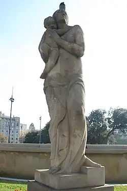 | Maternidad | Vicenç Navarro | Piedra | 2,73 x 0,92 x 1 | Es una de las figuras situadas en la terraza superior, de las que originalmente debían ir en el templete diseñado por Nebot para la plaza. Al anularse dicho proyecto, quedó como una escultura exenta, situada sobre un pedestal y mirando hacia el lado de montaña de la plaza. Se trata de una alegoría de la maternidad, representada por una mujer con el torso desnudo y una túnica que la cubre de cintura para abajo, y que sostiene en sus brazos un niño. Este tema estaba de moda en la época, relacionado por lo general con el conservadurismo, no en vano se trataba de un encargo oficial de parte de unas instituciones que emanaban de la dictadura de Primo de Rivera. Navarro realizó otras dos obras para la plaza, Mujer con ángel y La noche, aunque esta última fue instalada finalmente en el Parque de la Ciudadela.[18] | |
