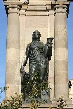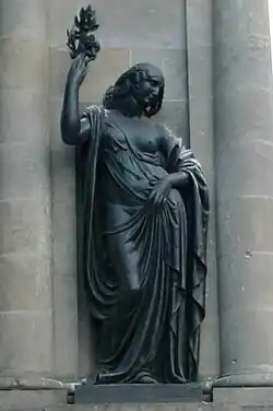 | El Espíritu popular | Jaume Otero | Bronce | 2,15 x 1 x 0,40 | Ubicada en el mismo pilar que la anterior, representa una mujer con el brazo derecho alzado sosteniendo una corona de laurel, mientras que con la mano izquierda se aguanta la túnica en la cintura. Aunque por el título parece tratarse de una alegoría, la iconografía es confusa. La estilización de la figura y una cierta artificiosidad confieren a esta obra un aire cercano al art déco. En su base se representa el escudo de Barcelona. Fundición: Gabriel Bechini (Barcelona).[35] | |