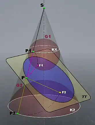 - Si (como ocurre a menudo) se toma la definición de la elipse como el lugar geométrico de los puntos P tal que d(F1, P) + d(F2, P) = 2a (siendo 2a una constante igual al eje mayor), entonces el argumento anterior demuestra que la intersección del plano π con el cono es en realidad una elipse.