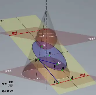 Usando de las esferas Dandelin, se puede demostrar que cualquier sección cónica es el lugar geométrico de los puntos para los que la distancia de un punto llamado foco es proporcional a la distancia de la directriz.[4] Los antiguos matemáticos griegos como Pappus de Alejandría ya eran conscientes de esta propiedad, pero nuevamente las esferas de Dandelin permiten facilitar mucho la prueba.[3]