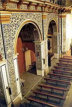 Los asuntos esgrafiados son básicamente fitomórficos (hojas y flores), aunque también se evidencian otras motivaciones figurativas: antropomórficas (fisonomías humanas) y zoomórficas (terrestres y acuáticas). Destaca sobremanera la ornamentación de la cúpula de cañón del presbiterio, donde la profusión de motivos florales se hallan enmarcados en espacios geométricos, rectangulares y cuadrados, que se alternan, conteniendo cada uno idénticos motivos, simétricamente repetidos a lo largo y ancho del arco. Sin embargo, el delirio ornamental se manifiesta con especial intensidad en la secuencia de la parte alta del testero, donde la profusión de formas vegetales (hojas de vid y racimos), zoomórficas y antropomórficas alcanza su clímax. Culminación y apogeo que se distribuye rellenando todo el espacio, entre los dos querubines que hay a cada lado, por encima de una variedad de recipiente, de cuya embocadura parece emerger un ave con forma de lechuza -ave rapaz, símbolo de la sabiduría-, y toda aquella exaltación decorativa.[6]
